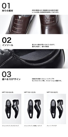 カラー展開 ブラック / ダークブラウン サイズ展開 38(24.0cm) / 39(24.5cm) / 40(25.0cm) / 41(25.5cm) / 42(26.0cm) / 43(26.5cm) / 44(27.0cm) / 45(27.5cm) / 46(28.0cm) ヒール高 MPT153-0 (A,B) / 3.2cm MPT153-1 (C,D) / 3.2cm MPT153-3 (E,F) / 3.2cm MPT178-1 (G,H) / 3cm MPT178-3 (I,J) / 3cm MPT178-4 (K,L) / 3cm MPT112-1 (M,N) / 3cm MPT114-1 (O,P) / 3cm MPT129-2 (Q,R) / 3cm MPT293 (S,T) / 3.2cm ワイズ 3E (EEE) 相当 素材 【アッパー】合成皮革(フェイクレザー) / 【ソール】合成素材 合成皮革の特徴 レザーより「雨に強く、カビがつきにくい性質」 また、お手入れも簡単で普段使いには最適な素材です。